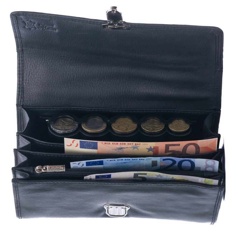 Deze zwart lederen kelnerbeurs / horecabeurs / taxibeurs is van het merk LeonDesign is gemaakt van stevig zwart rundleer, de randen en hoeken zijn dubbel- en door en door gestikt. Dit zorgt voor extra stevigheid. De binnenzijde is voorzien van 3 vakken om het briefgeld overzichtelijk te scheiden. Deze kelnerbeurs heeft een meegeleverde 5 gaats munthouder, de munthouder heeft plaats voor 5 verschillende muntsoorten. De kelnerbeurs wordt gesloten door middel van een ijzeren druksluiting, Deze is ontzettend stevig en kan nooit zomaar opengaan.