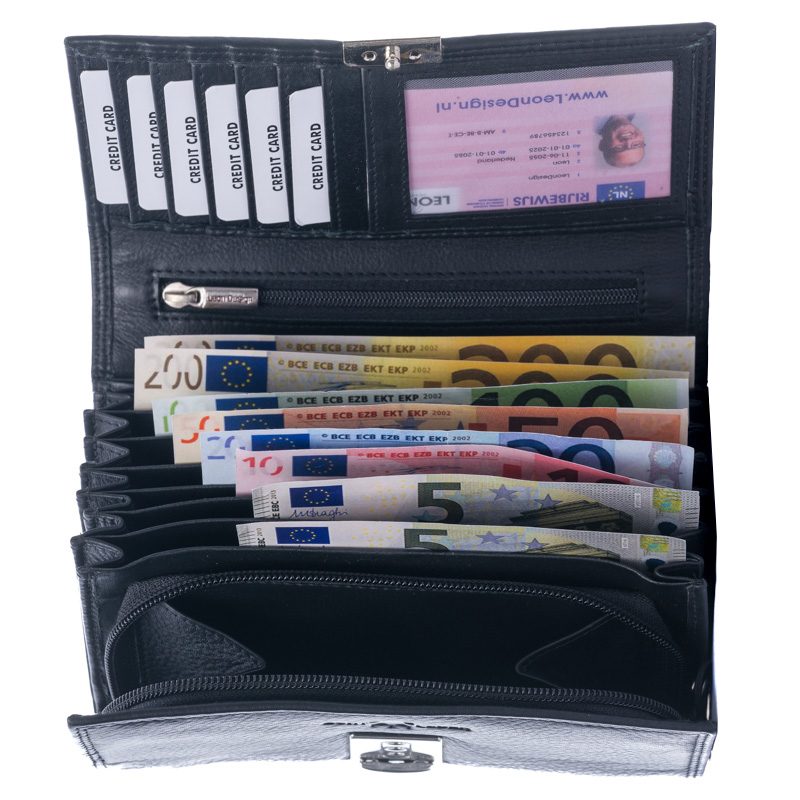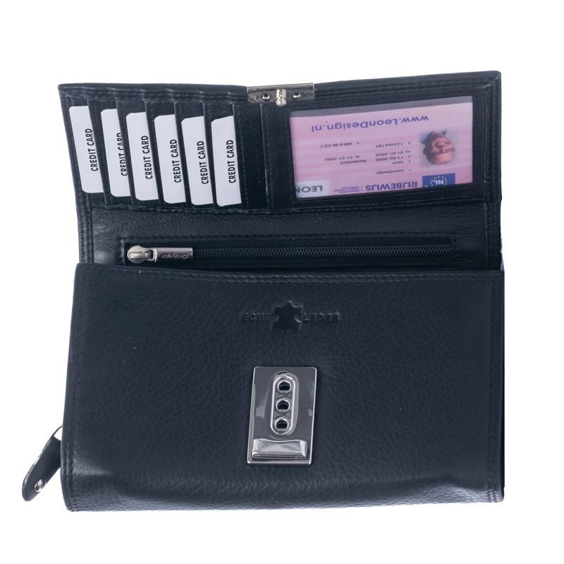 Kelnerbeurs met 7 briefvakken en ritsvak voor muntgeld – met Ketting – Leer – Zwart