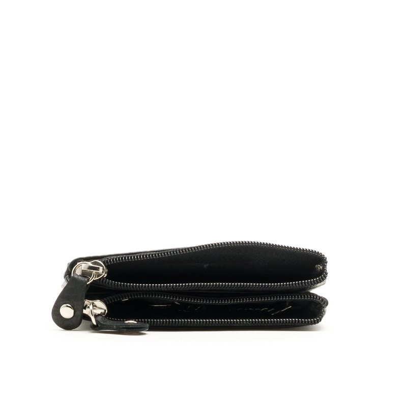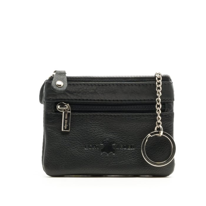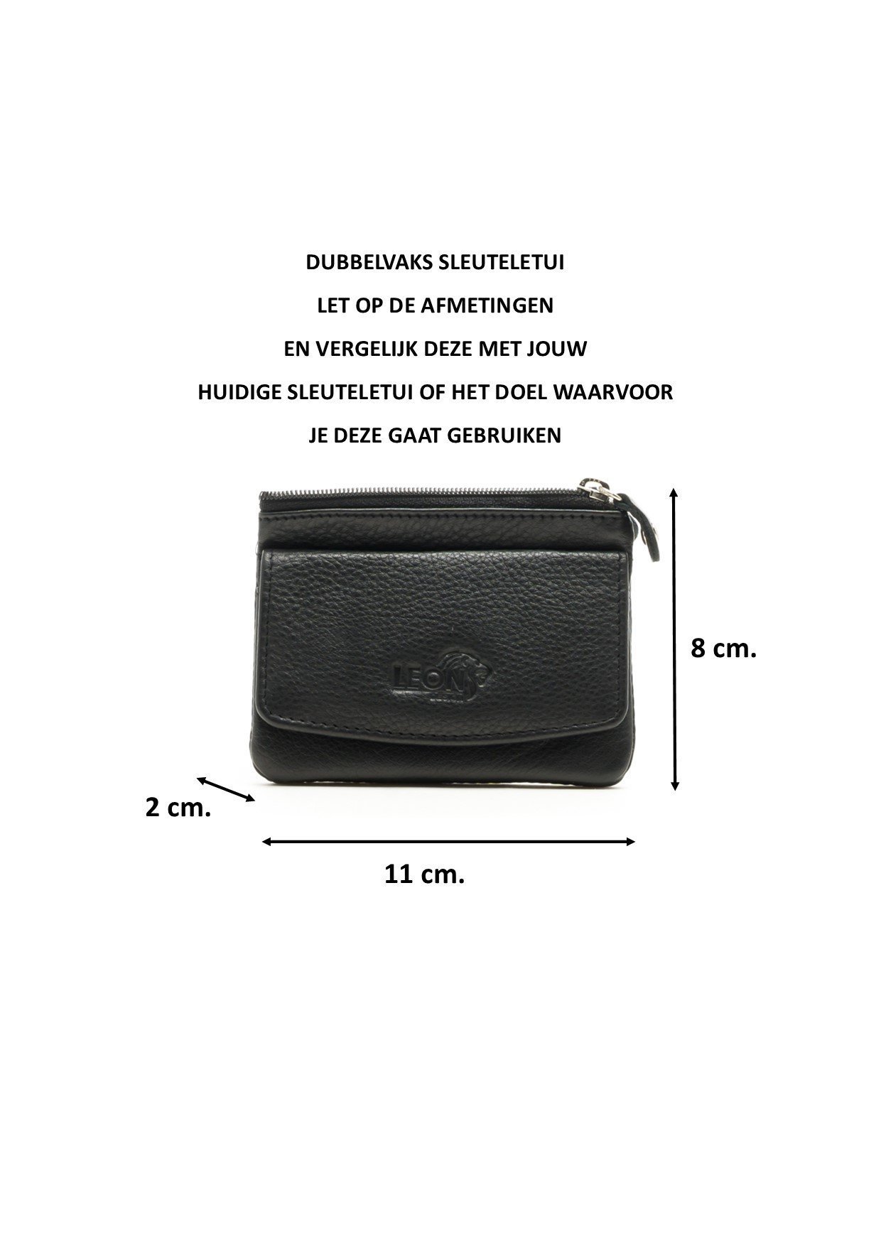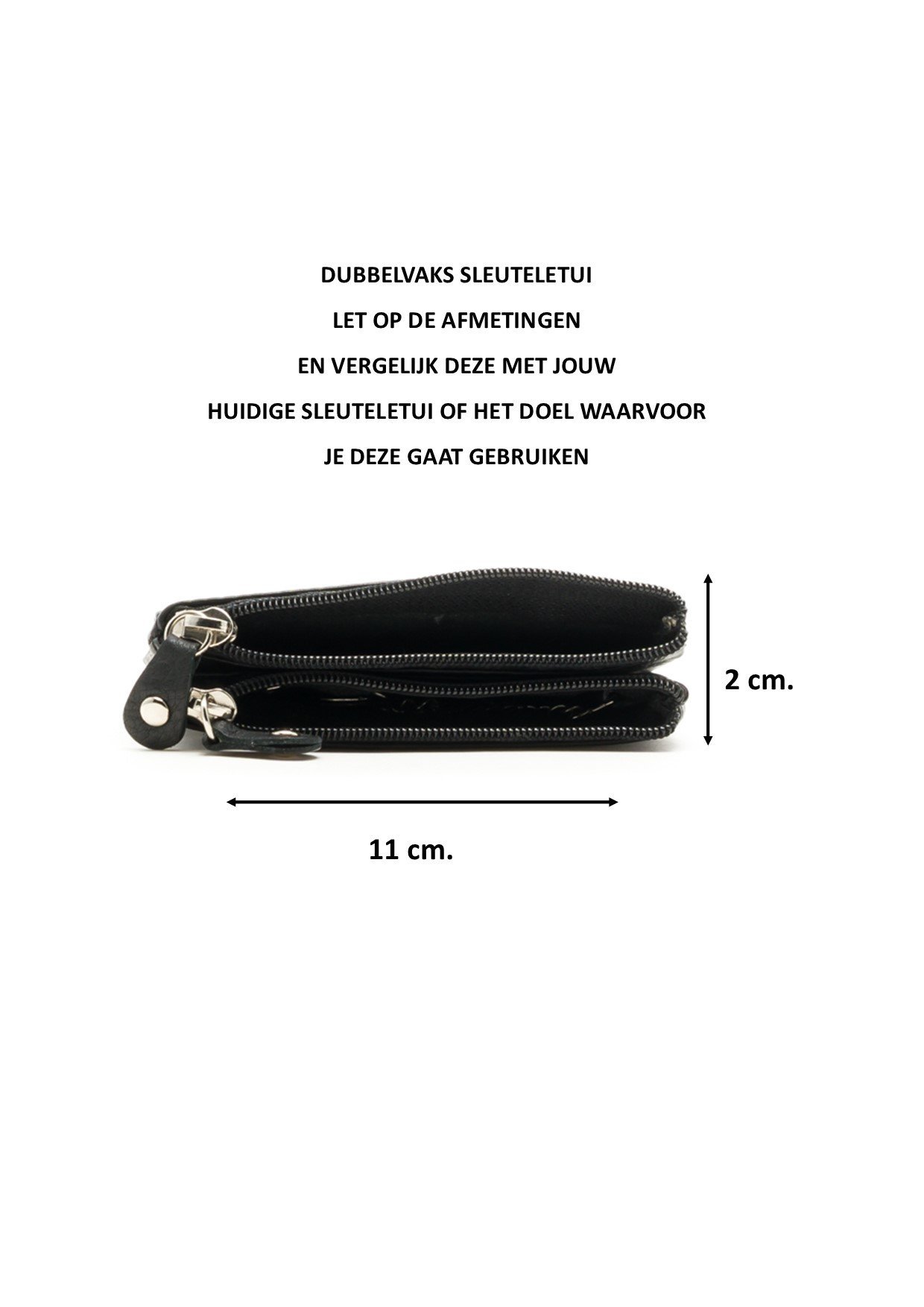 Echt lederen sleutel etui 2 vakken met klepje op voorkant, voorzien van 2 ritsen bovenop en 1 ketting met ring.